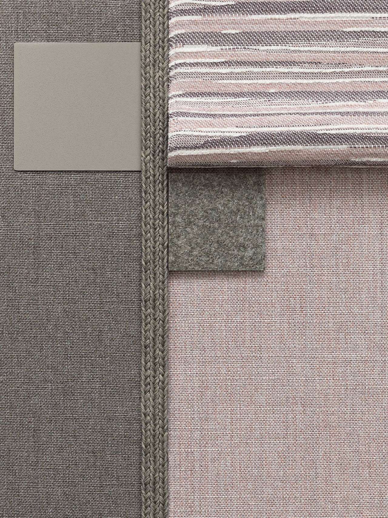 This moodboard is reminiscent of the surfaces and colours of a lush forest. It plays on light and dark green tones of the Menta, Amazzonia and Selva fabrics. These interact with two exotic aluminium shades: Green Tea and Dark Green. Like a lunar ray penetrating from above in the thick foliage, the Moon-toned rope creates a distinctive accent.