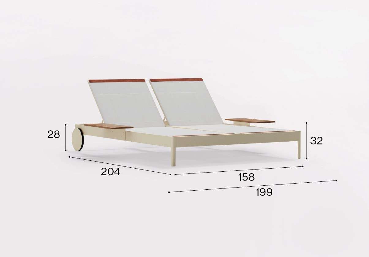 Double sunlounger in painted aluminium and Batyline fabric with castors and small table on the right and on the left