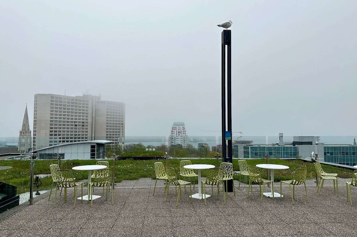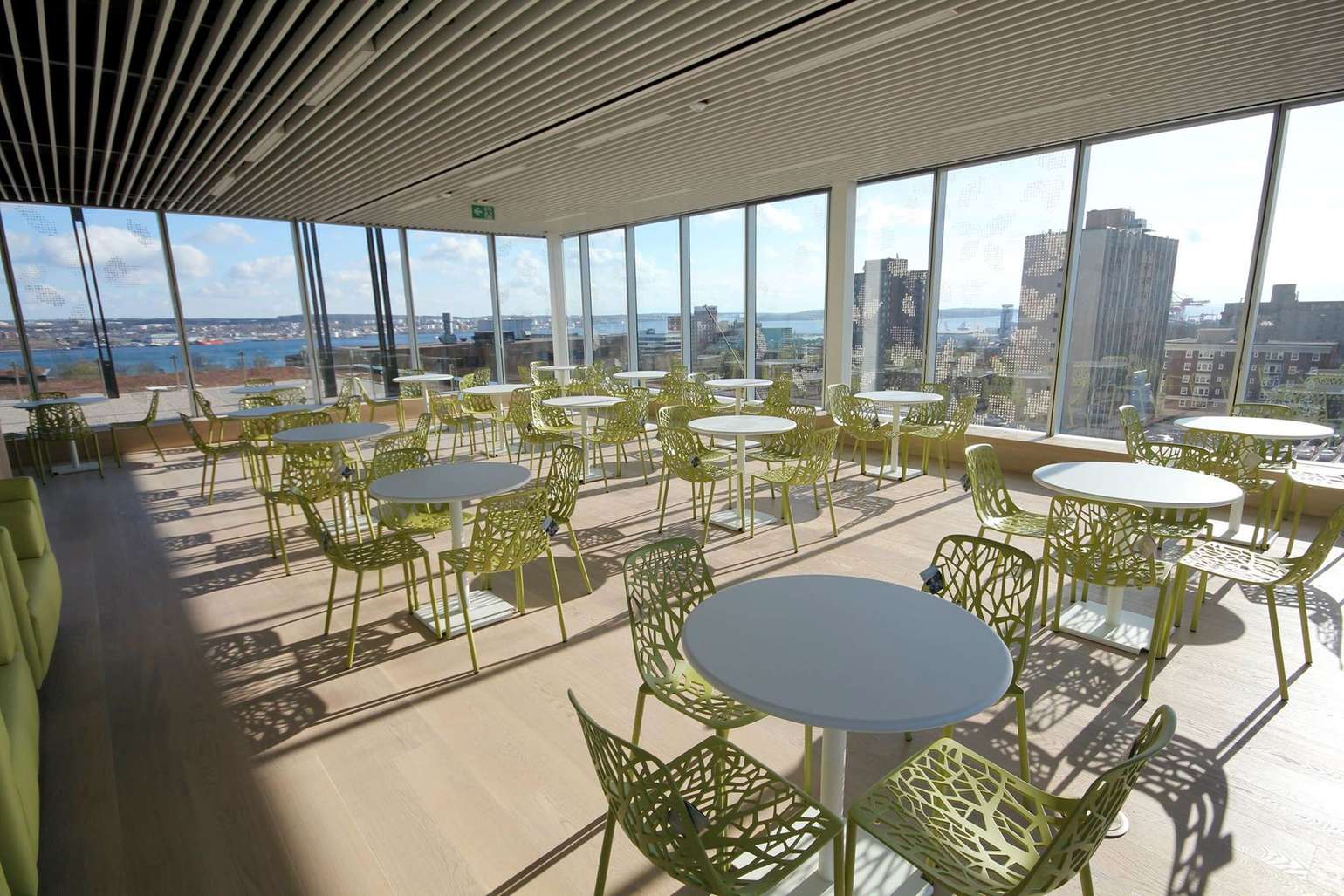 The Halifax Library features a distinctive architectural structure with large floor-to-ceiling windows and a top-floor terrace used as a café that turn out to be excellent viewpoints for enjoying breathtaking views of the city's historic heritage and adjacent harbor.