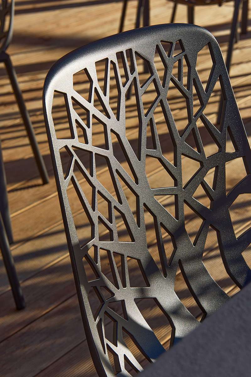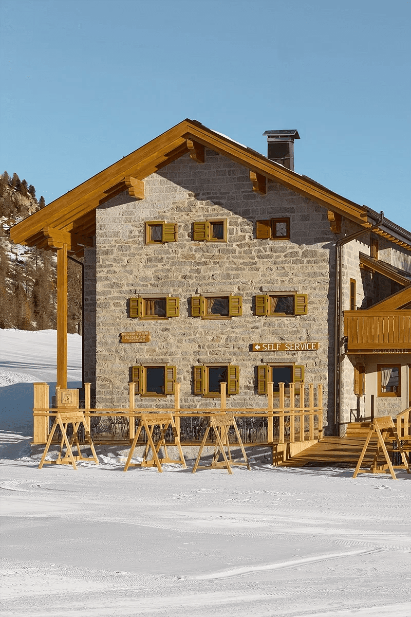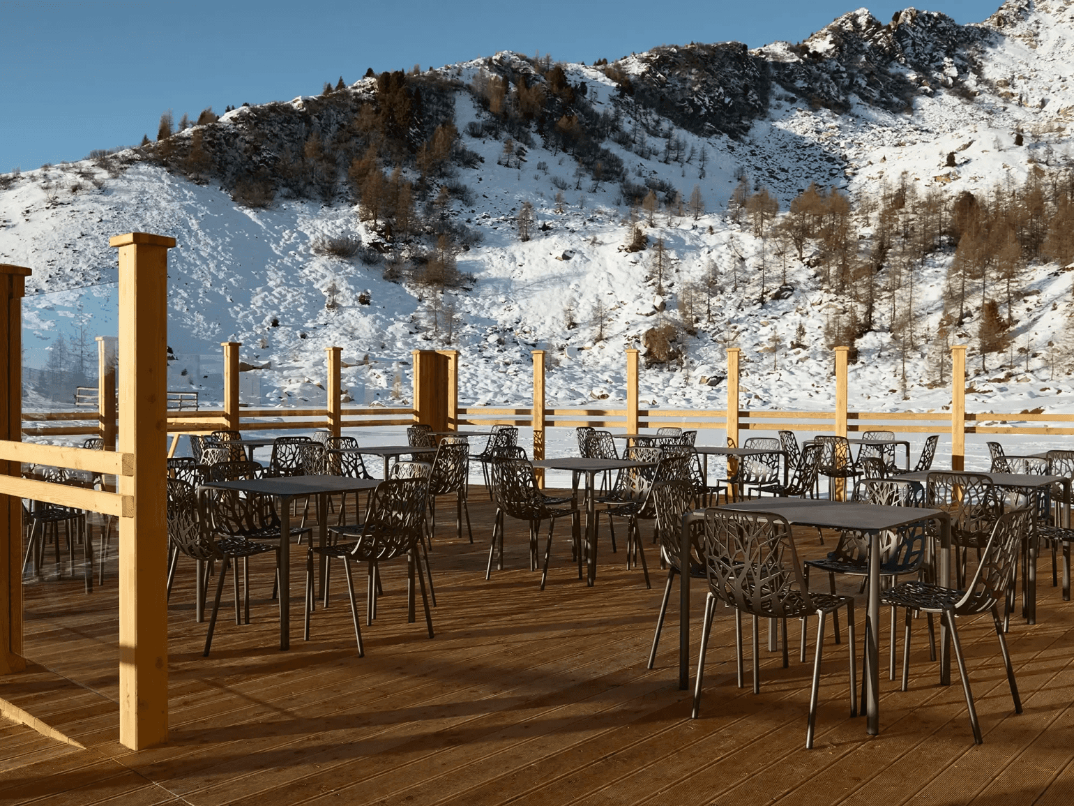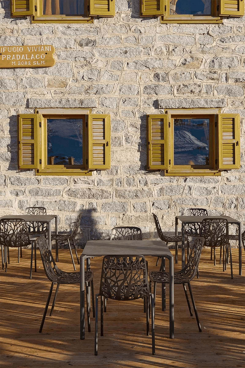 The Viviani Pradalago Mountain Hut, located at 2,082 meters in the heart of the Brenta Dolomites in Madonna di Campiglio, has an open-air restaurant on its panoramic terrace overlooking the alpine lake and ski slopes. The setting requires furnishings capable of resisting the harsh mountain climate conditions without giving up a refined and light aesthetic, in total harmony with the surrounding landscape.